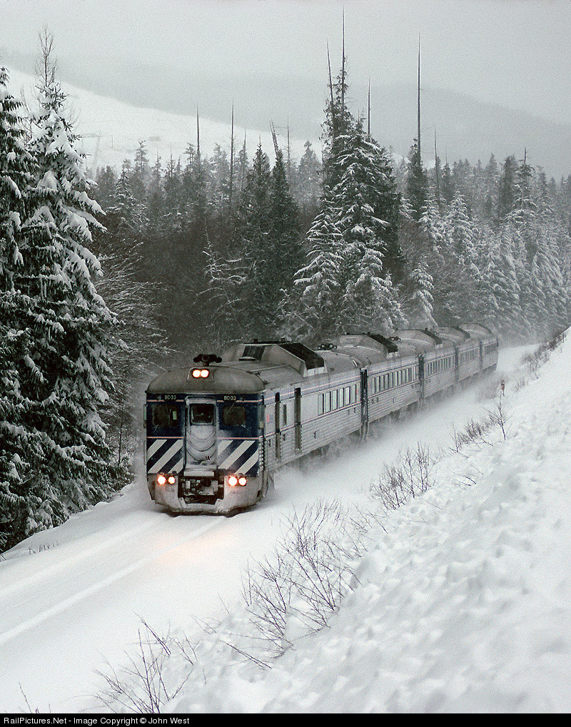 | I'm posting this in the hopes that Mother Nature will see it and it will remind her that Whistler could use some more snow. After detraining a bunch of skiers from Vancouver who didn't want to fight the traffic on the two lane highway, BC Rail's Budd car train heads east out of Whistler on its (then) daily roundtrip to Lilloet. |