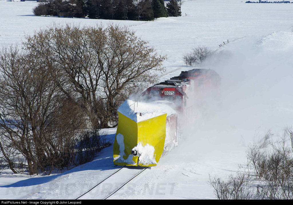 High winds and drifting prompted the DM&E to operate a wedge plow on its Sheldon Sub to the end of the line at its namesake town of Sheldon. Two red former CP units provide propulsion.