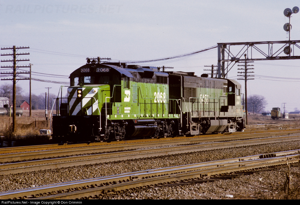 | Freshly painted BN GP20 2068, formerly CB&Q 932, and U28B 5455 run light westbound on Main 1 of the "racetrack" at West Eola, IL. |