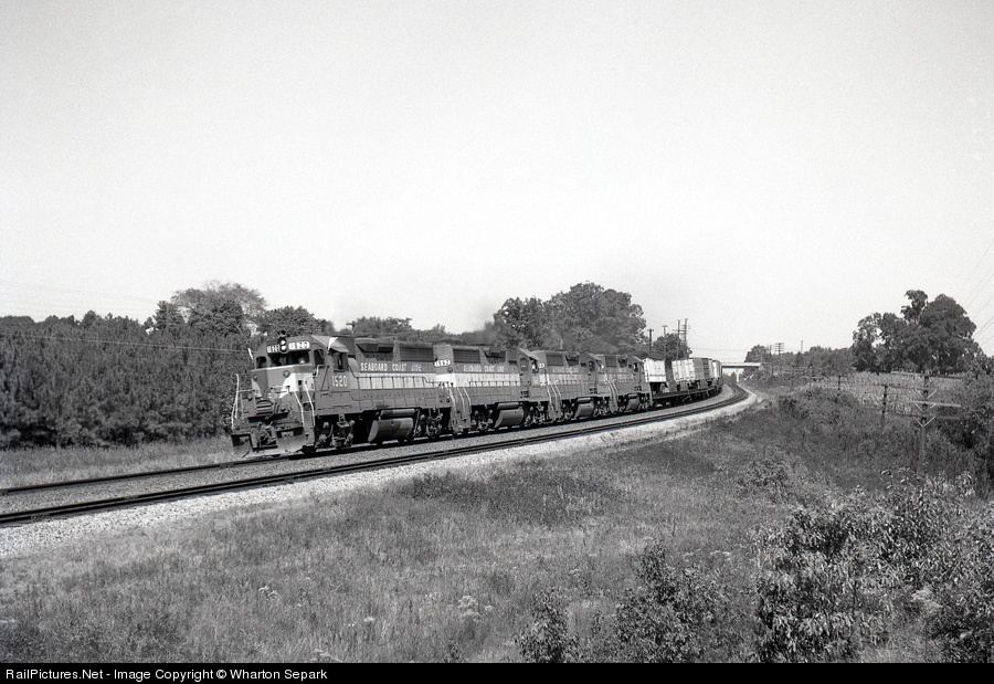 Four SCL GP40's in the "split image" paint scheme are in charge of piggyback train No. 175 sweeping through Millbrook, NC. The train is running as an extra because No. 175 had recently been routed over the old "S" line and its' schedule was not in the current timetable. No. 175 operated via Raleigh and Hamlet for several years before its' schedule was returned to the "A" line and No. 275 became the dedicated piggyback train over the "S" line operating via Raleigh, Hamlet, thence Atlanta.
