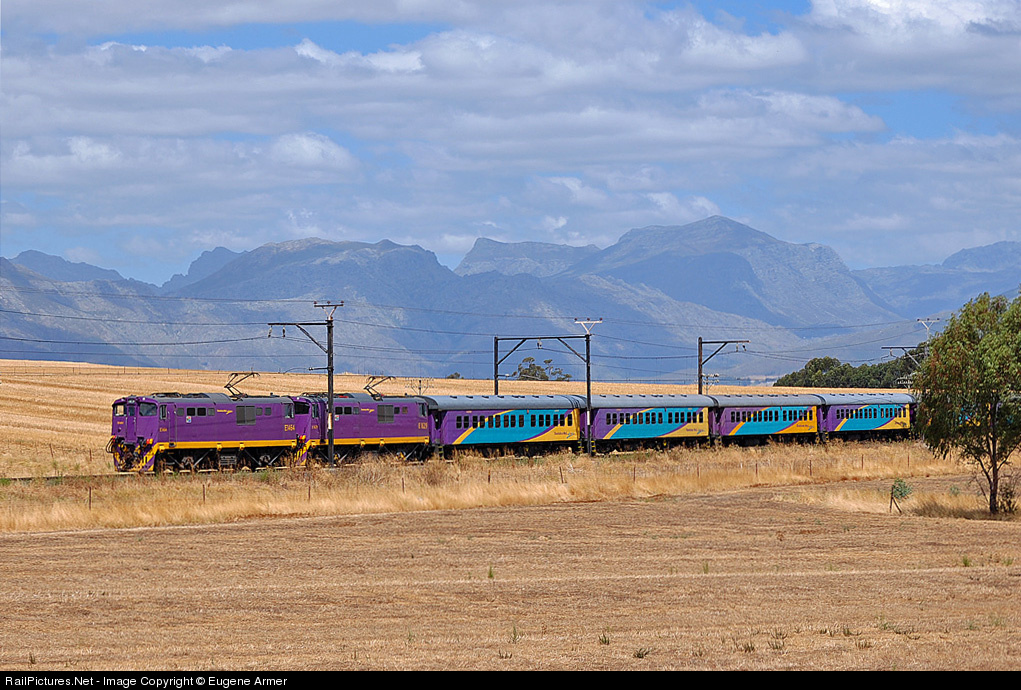 | The weather forecast said partly cloudy, but for this shot I was lucky and got the sunny part, plus a bonus - my first sighting of double 6E1's in the new passenger livery! Shosholoza Meyl's Cape Town - Johannesburg "Tourism" heads north through the Boland (Uplands) region of the western Cape, heading to its next stop at Worcester. |