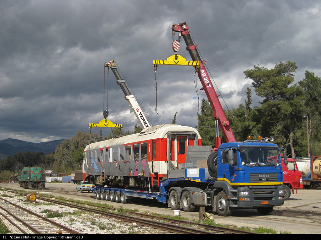 Metric gauge MAN IC dmu is being loaded into a special truck for trasfer at Peireus central locomotive shops for repairs.