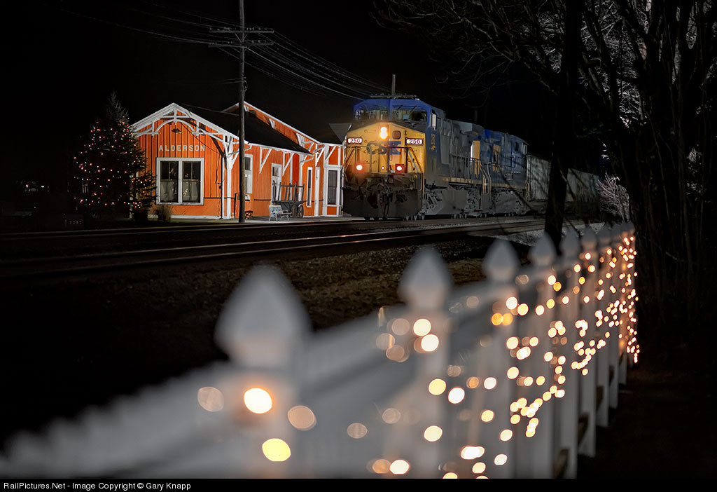 Alderson at Christmas! Christmas lights accent the uinique, original C&O station here as CSXT 250 enters into the scene with another 149 car loaded coal train at 21:22! My first night the lights went off after midnight! The problem? Timers! Everything was on separate timers. LOL! My fourth night produced success along with a new appreciation for the natives toward their orange station.