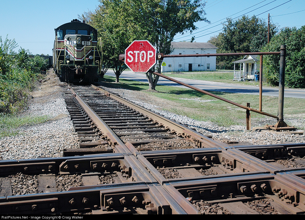 An interesting Carolina Southern consist (GP18 951, F9B 6622 and GP38 4002) is tied down in Mullins, South Carolina, and protected by a smashboard at the CSX diamond. The CALA line was originally Atlantic Coast Line's Wilmington-Florence line, and the CSX trackage crossing here was formerly Seaboard Air Line's Charleston line. For another smashboard image from my Smashboard Tour 2008, click here.