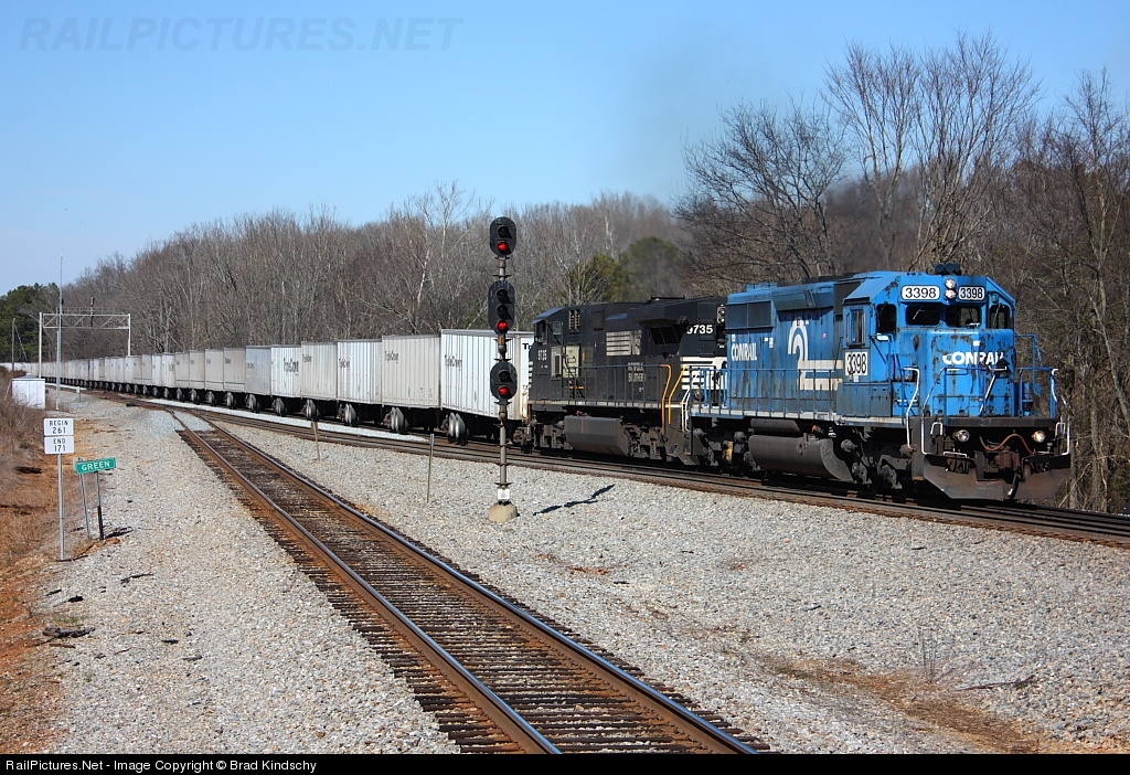 | A Roadrailer heads down the Atlanta North District at NS Green, where the Cedartown District splits off to service two power plants on the ex-Central of Georgia. Ridden hard and put up wet, this Conrail SD40-2 probably doesn't have many years left. |