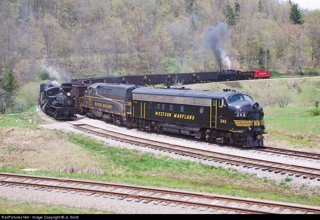 Here is a scene from the Spruce festivities during Cass Railfan Weekend 2009. Western Maryland power in the form of an FP7 and BL2 head up a hopper train with Shay #6 "pushing". On the near track we find Cass #5 and her log train.