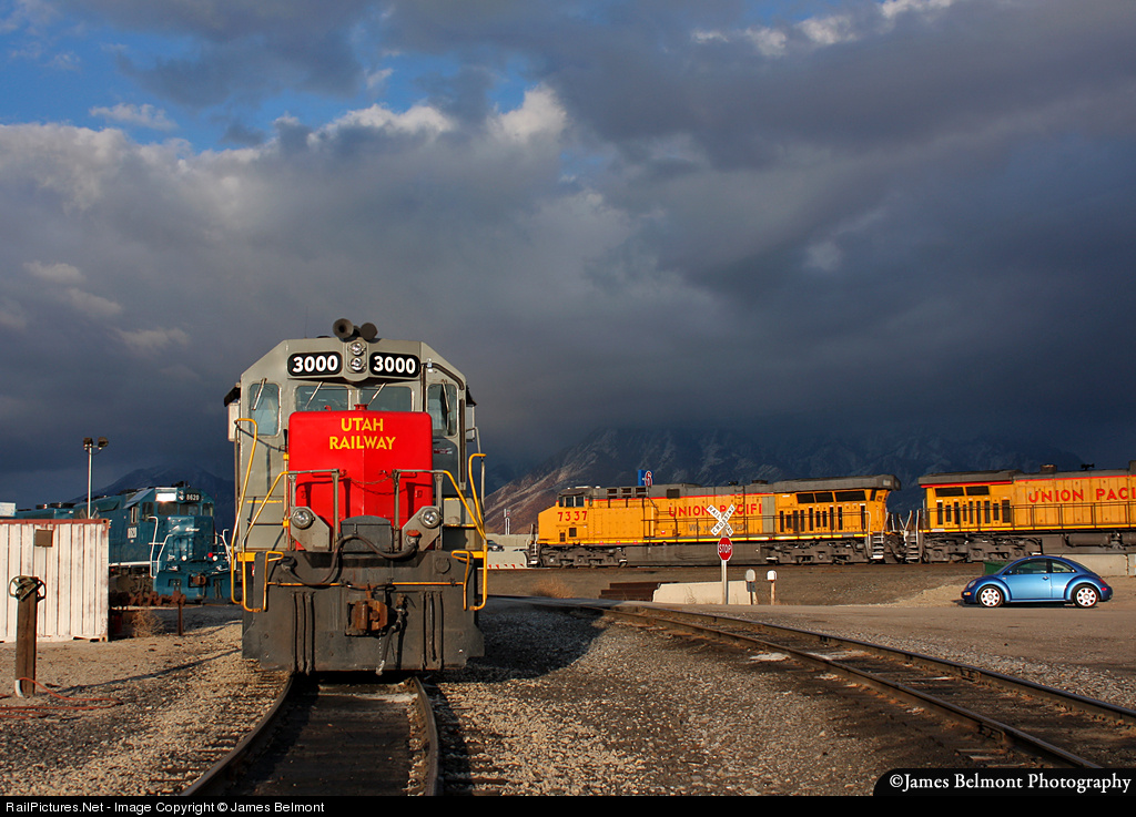 With lots of great storm lighting along the Wasatch Front, a Union Pacific Denver, CO to Salt Lake City, UT manifest charges west through Midvale about 5 miles from the end of it's 570 mile journey west from North Yard in Denver. The UP 7337 was built by GE in Sept. 1996 as the UP 7051, an AC604400 'convertible'. The plan was to upgrade the unit to a full blown 6000 HP motor one day, which never happened. Now it's distinct in it's large coolant housing area along the rear of the long hood but otherwise it's just another UP AC4400CW. Utah Railway and Savage Bingham & Garfield power lay over in the yard, awaiting a Monday morning call to duty.
