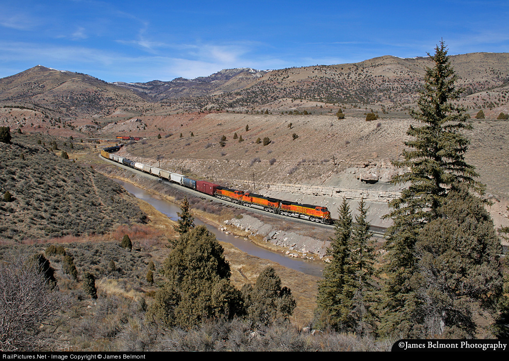 A trio of ubiquitous BNSF H-2 clad C44-9W's lead a short Stockton, CA to Denver, CO trackage rights manifest along the ex-D&RGW at Kyune. From this point the descent increases from 1% to 2.3% on the way east to Castle Gate. If you look closely, a fourth H-2 GE is DPU'd at the rear end of the train.