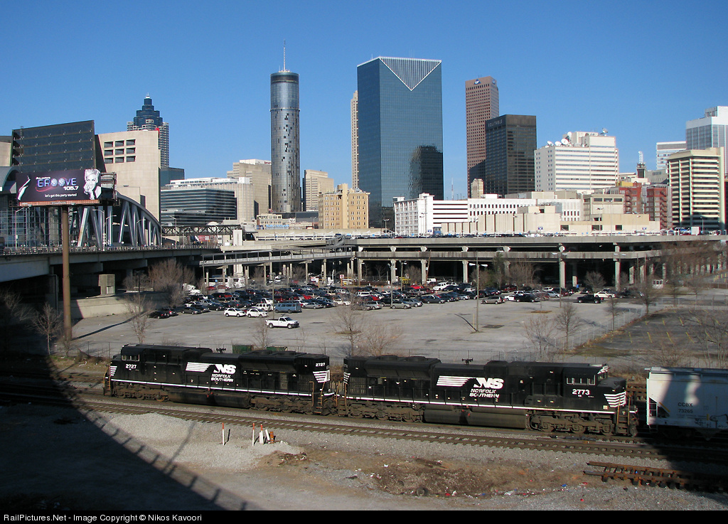 | As the sun drops and the shadows move in, a matched pair of EMD SD70M-2's growl north through the railroad gulch with the Atlanta skyline in the background. Repairs have finally been started on the Westin Hotel which had a large amount of glass blown out by the 2008 Atlanta tornado. |