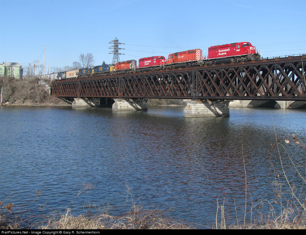 This late arrival, delayed by a maintainer checking out a possible small crack in the gauge at Menands, made for a heaven sent gem catch over the blue waters of the Mohawk Runoff. Power is four SD40-2s; CP '5698','5671','5690'&'5691' followed by two CSXT units, SD70M '4530' and SD50-3 '2453' being delivered back to NY State from Canada.