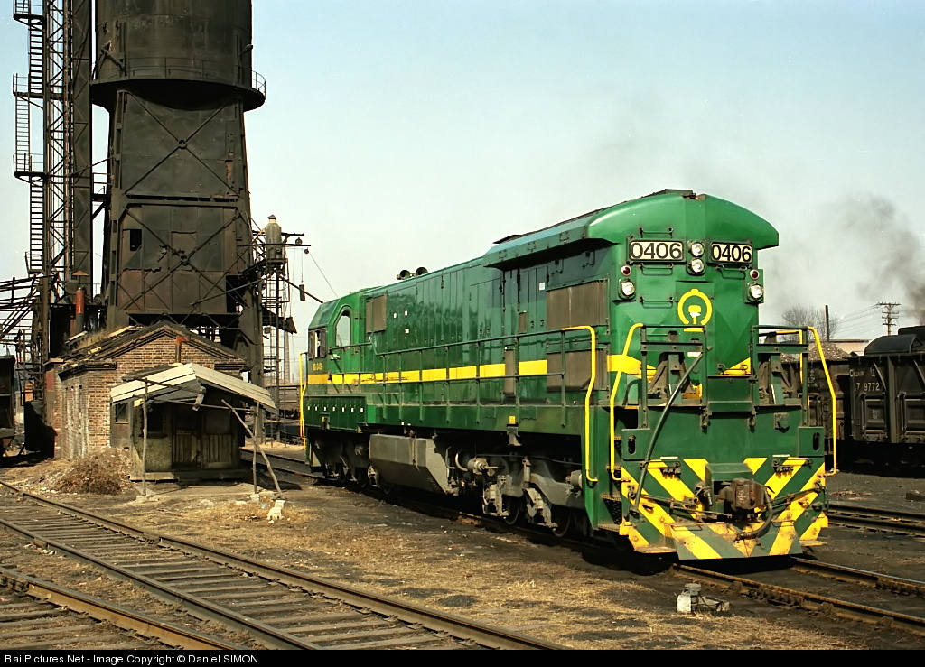 This Chinese diesel locomotive cannot deny its American origin. Over the years, China has imported a number of foreign diesel locomotives. The most successful are certainly the ND5 class diesel electric Co-Co’s built by General Electric in the mid 1980’s. The first 200 were basically GE's standard 3600 HP, C36-7 model (see picture 315885). The later locomotives, including the 0406 seen here at Sujiatun, had a modified cab and lower short hood. China bought more than 400 ND5, many more than were bought by US railroads.