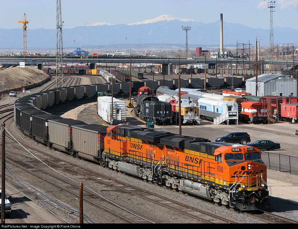 | Another train of black diamonds, lead by two clean looking GEVOs, snakes its way around the former Union Depot passenger tracks which are now used to display equipment for the Pueblo Railway Museum. |