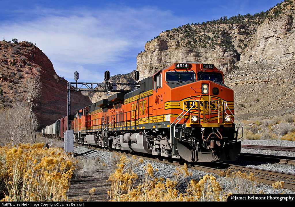 | Burlington Northern & Santa Fe Railway's Stockton, CA to Denver, CO rambles east along former D&RGW rails at Castle Gate, Utah. |