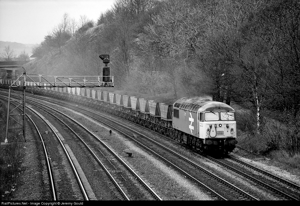 | 56005 accelerates hard through Chesterfield with the Markham Colliery to Didcot Power Station loaded MGR. 56005 was withdrawn in July 1996 and cut-up in August that year at CF Booth's, Rotherham (info courtesy WNXX.com). Taken on Ilford XP1. |