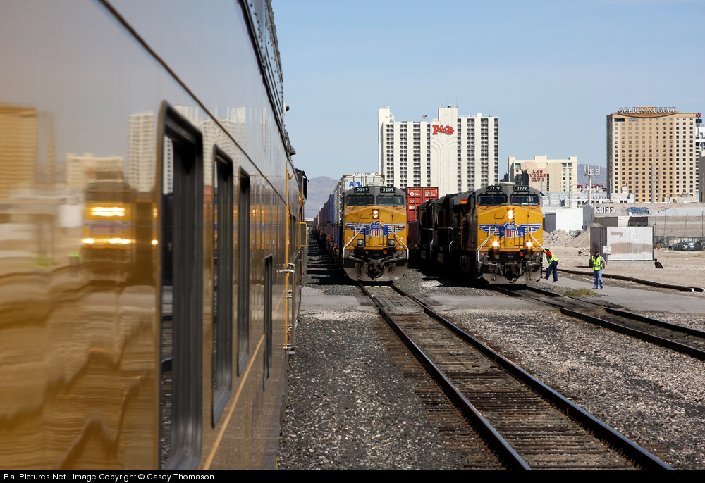 | Operation Lifesave Special, eastbound stack DPU, and westbound stack head end, all at the UP yard office in Las Vegas |