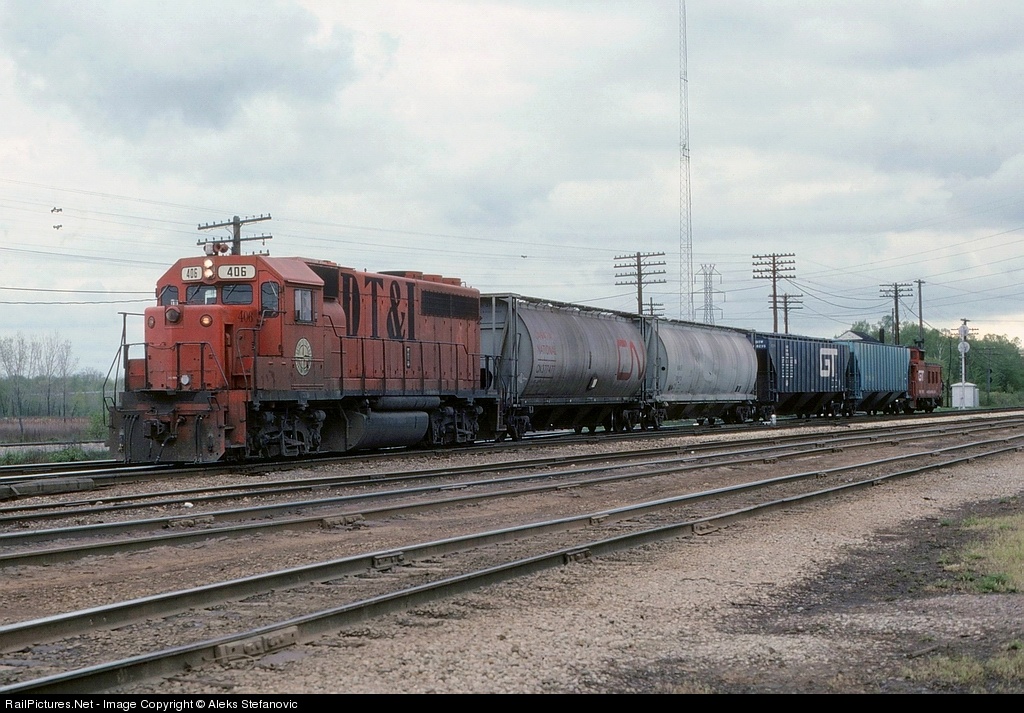 | DT&I 406 is leading this local with 4 cars and GTW caboose 79170 by Tappen which is just west of the GTW Port Huron yard. Tappen is the junction of the Mount Clemens Sub which comes up from Milwaukee Jct and the Flint Sub. Also crossing at this location was the C&O line from Saginaw to Port Huron. |