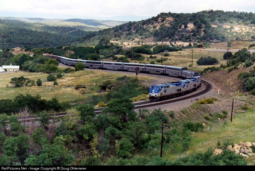 | Amtrak's Southwest Chief climbs the grades of Raton Pass, N.M., leaving Colorado. |