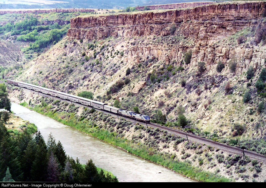| The eastbound California Zephyr rolls along the Colorado River just east of Burns, Colo., between Bond, Colo., and Dotsero, Colo. |