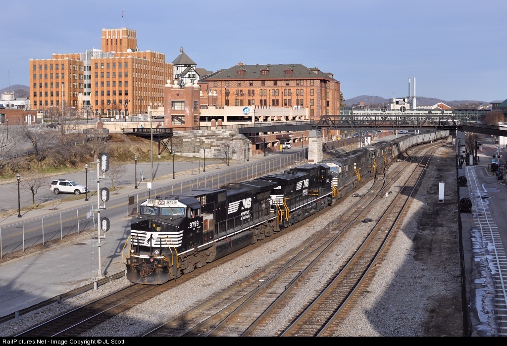 A hopper train arrives just in time to capture a late afternoon scene of downtown Roanoke. Both yellow brick buildings were once N&W offices and the Tudor-style building behind them is the Hotel Roanoke, built in 1882 by the N&W. The stacks and sign at upper right are part of NS's Roanoke Shops and the city's "Railwalk" can be seen at far right. Although this shot was taken from the Gainsborough/2nd Street bridge, NS still refers to the location as "Commerce Street" for the grade crossing that was here prior to the bridge's construction. See photo 211941 for an April 1999 view from the same location.