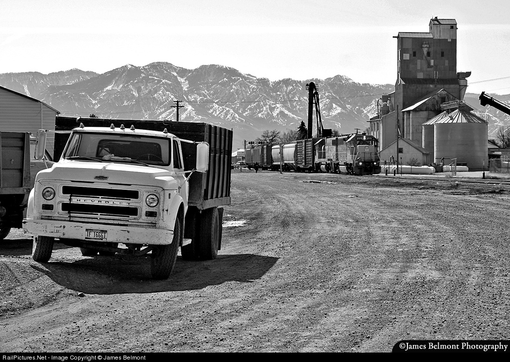 Union Pacific's Cache Valley Local arrives at the end of the 51 mile Cache Valley Industrial lead at Preston, Idaho. At left, a work truck owned by the Franklin County Grain Growers Association awaits it's next call to duty.