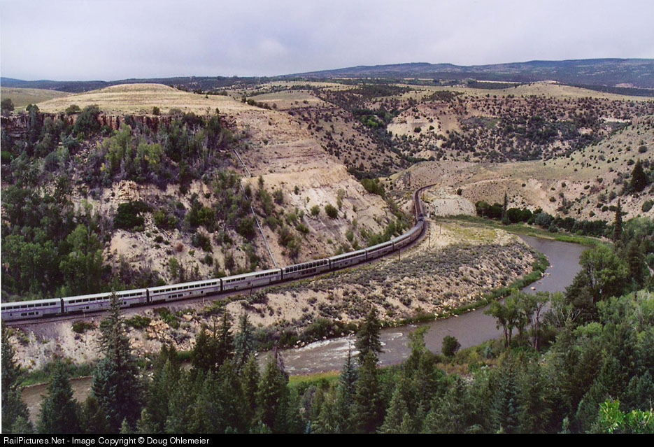 | The California Zephyr rolls along another of many spectacular canyons along the Colorado River east of Burns, Colo., from high atop a sand road. |