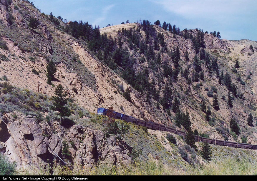 The California Zephyr rolls along the Colorado River through spectacula Byers Canyon, nearing the end of the canyon, west of Hot Sulphur Springs, Colo.