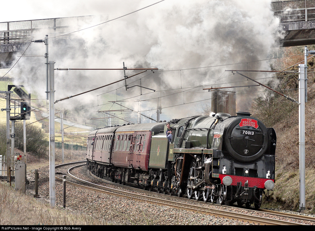 | 'Britannia' Pacific 70013 'Oliver Cromwell' leans to the curve at Low Gill, bound for Carlisle with an excursion, surprisingly run on a Friday, for Carlisle. Train 1Z22 is dodging 125 mph Pendolinos on Britain's West Coast Main Line. The train was a sell-out despite the mid-week schedule. |
