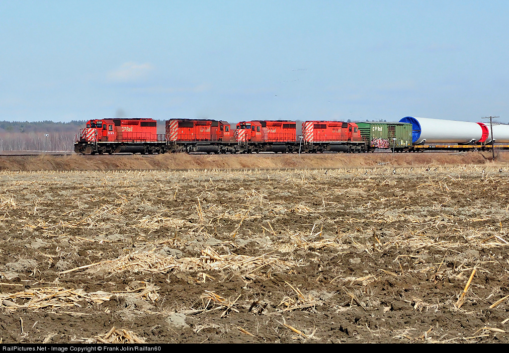 The unmistakable chant of older EMD prime movers can be heard though the countryside as CP 5766 West, slices through farmland with wind mill towers bound for the U.S Midwest