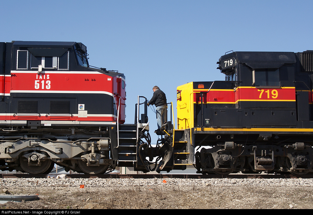 Rock Island heritage GEVO 513 has knuckled onto GP38-2 719 spotted on the siding and now, the conductor hooks up the chains and drops the steps getting ready to move.