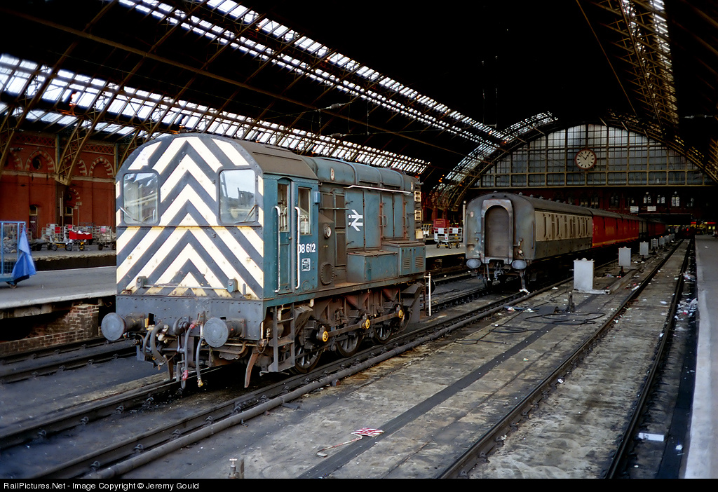 | Willesden based St Pancras station pilot 08612 stands on the centre road in company with some TPO vans. Withdrawn in September 1990, 08612 was cut-up in March 1991 by MC Metals, Glasgow (info courtesy WNXX.com). |