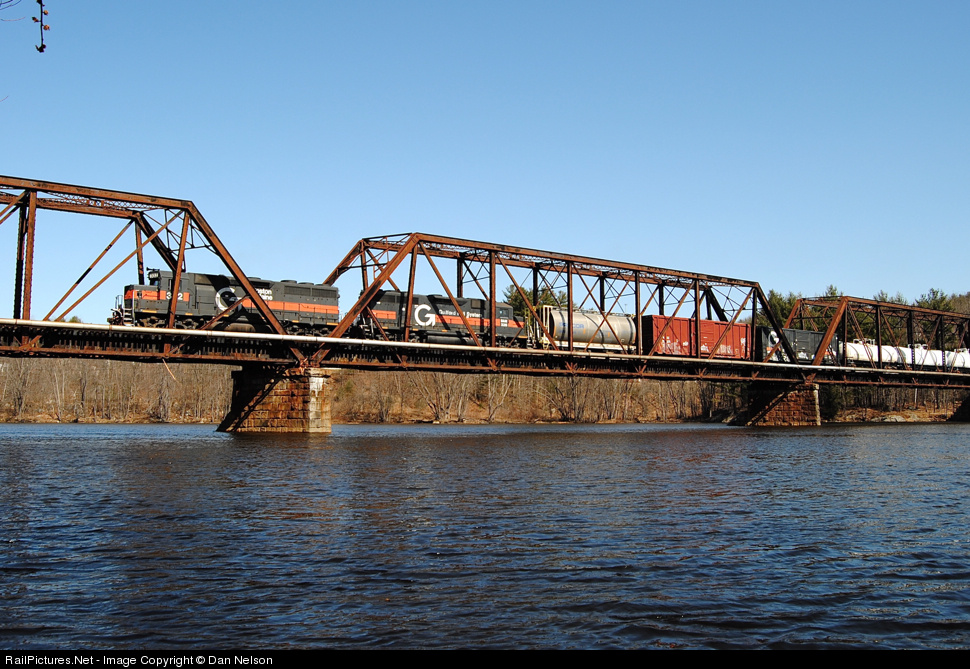 | PORU crosses the impressive, yet seldom photographed, bridge over the Androscoggin River in Jay on the Rumford branch as it approaches Rileys. 332 is unique considering it is the last Guilford unit that still has Boston & Maine fully spelled out on its sides. |