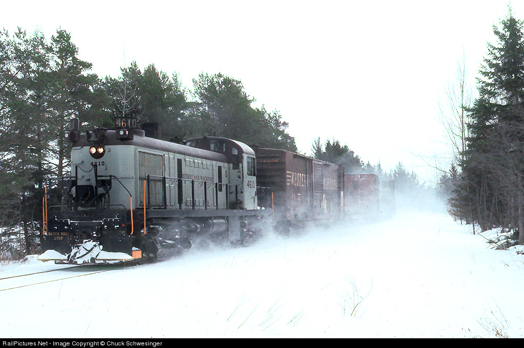 | D&M 4610 sifts through fresh snow as it departs Cheboygan with 3 cars headed to Mackinaw City to work the car ferry. In a odd twist the D&M did all the switching of the Chief at Mackinaw City while the Michigan Northern supplied most of the freight that used the car ferry. |
