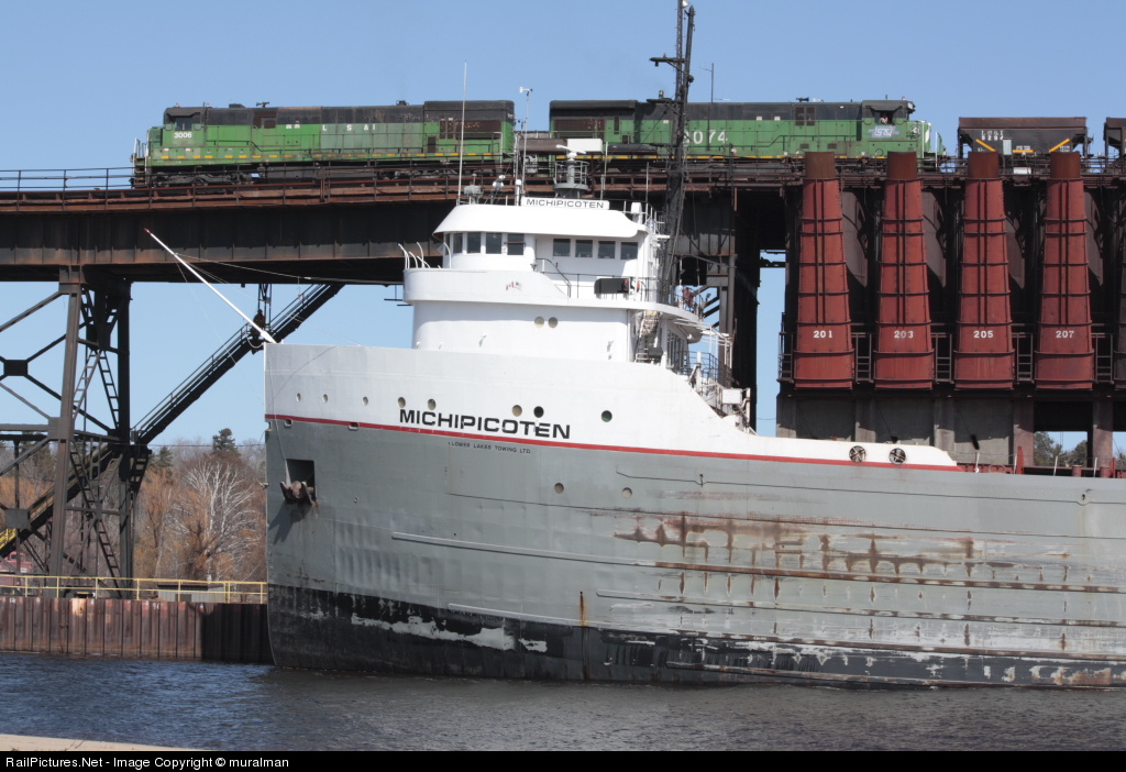 LS&I dock job with U30C 3006 and C30-7 3074 (both ex-BN) shove loads onto the Presque Isle ore dock while Lower Lakes freighter Michipicoten waits to load.