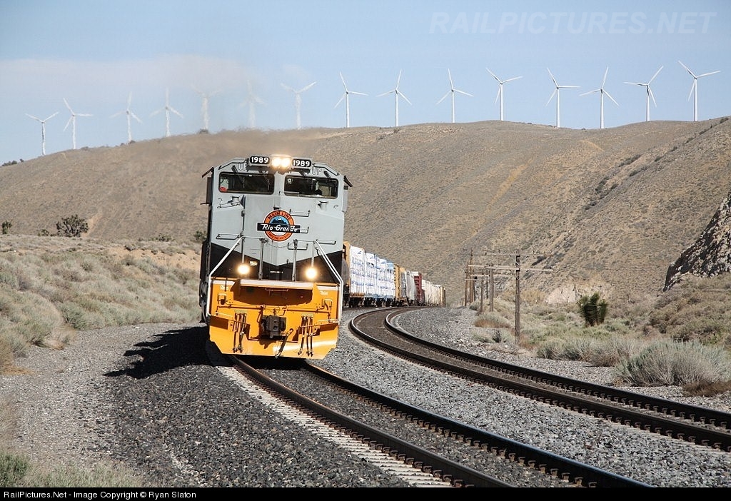 | UP 1989 drags the MWCFR 29 up the grade of the Tehachapi's. As the train was leaving Mojave one of the trains 3 motors failed and the crew had to drag the train up the pass with 2 engines. |