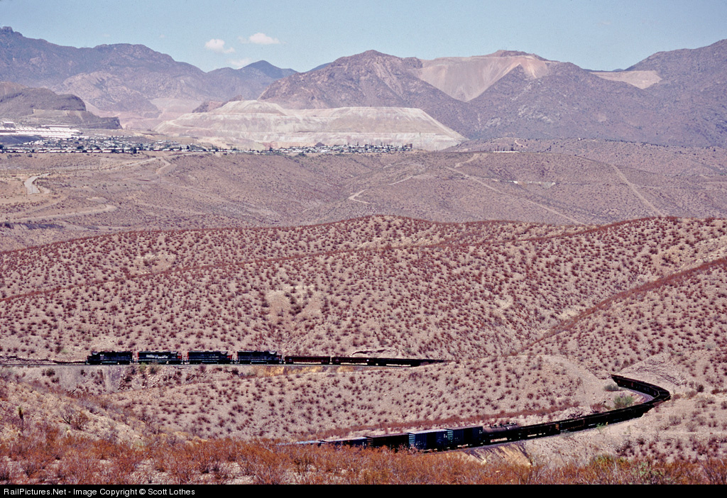 Union Pacific's Clifton Local wraps around the horseshoe curve at top of Drive Canyon near Clifton, Arizona. The local ran six days per week out of Lordsburg, New Mexico, to serve Phelps Dodge's Morenci Mine, among the largest copper mines on the continent; its tailings are visible in the background. The Arizona Eastern Railroad now operates this line, having acquired it from UP in 2007.