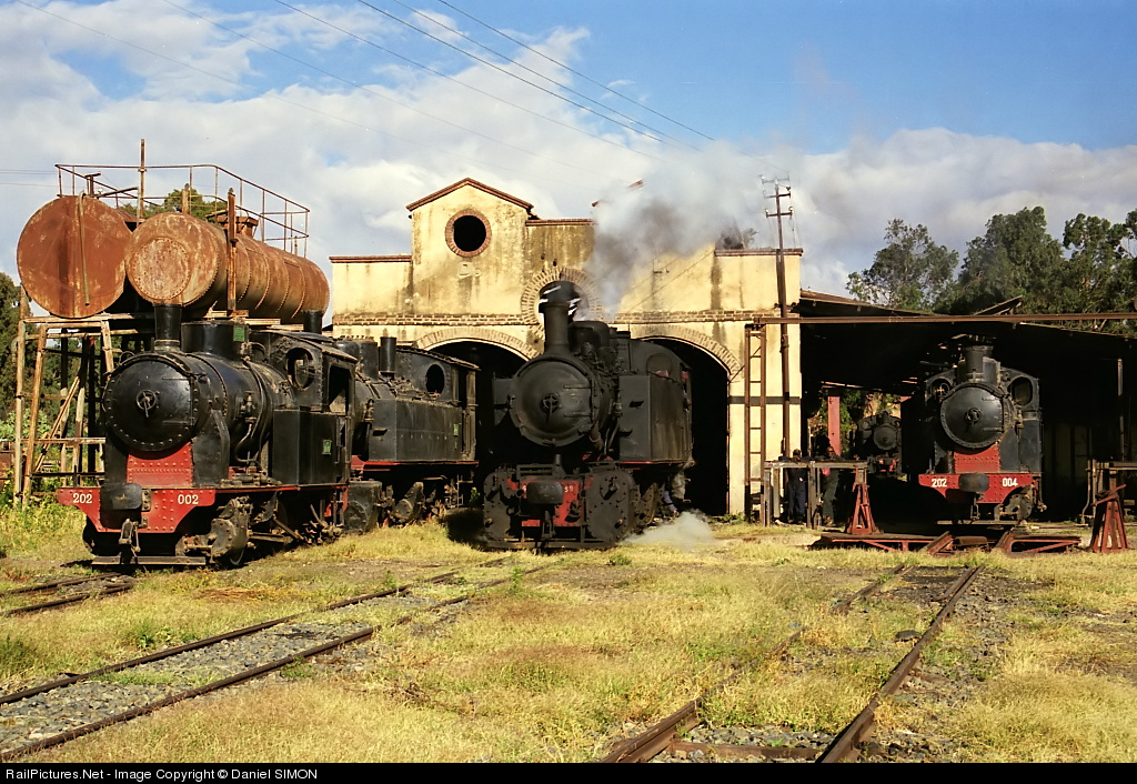 | Three classes of steam locomotive still exist today in Eritrea and they are all shown in this picture. The small 0-4-0 tank engines of the 202 class were the standard shunter locomotives of the system. They have been built between 1927 and 1937 by Breda in Milan. The 440 class Mallet locomotive has been built by Ansaldo in Genova in 1915. The larger locomotives of the 442 class were also built by Ansaldo in Genova but in 1938. |