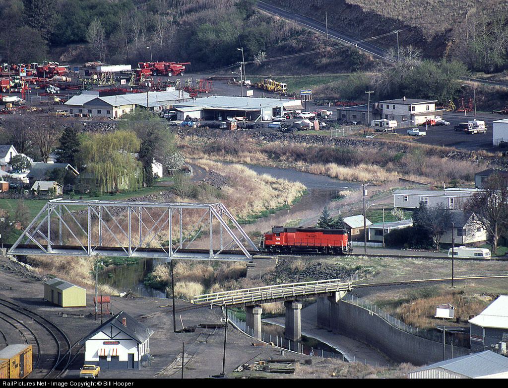 | A loco is turned on the wye at Colfax in the narrow Palouse River valley before heading south with a train to Moscow Id. This was the original UP(OWRN) line to Spokane before the Avery cutoff over Joso bridge was built. |