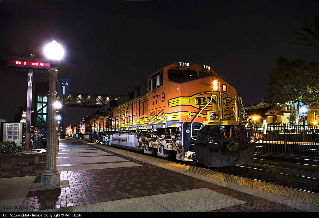 | BNSF 7719 made an unusual stop at the Fullerton train station. Westbound trains, if they come to a stop, almost always stop at Basta and not the station. This was a rare photo opportunity. |