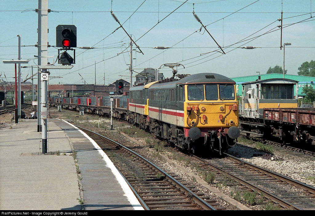 | 86431 & 87020 'North Briton' bring the Mossend New Yard to Dee Marsh Junction steel coils into Warrington Bank Quay. 37902 worked the train south of here. 86431 was scrapped in March 2005 and 87020 is currently at work in Bulgaria (info courtesy WNXX.com). |