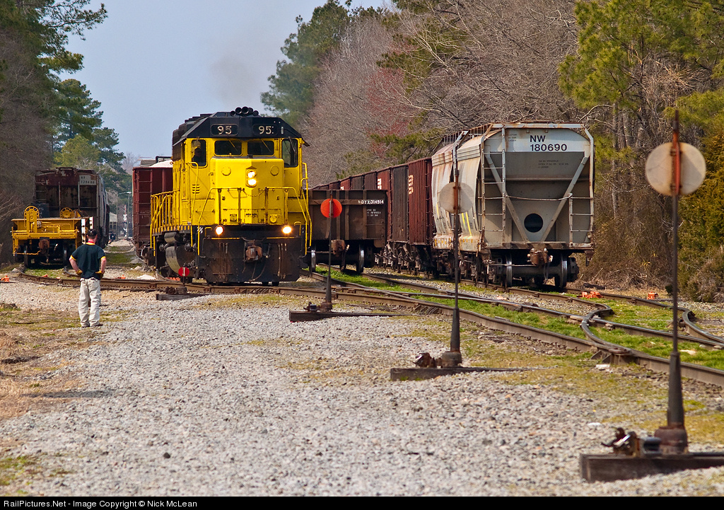 | After arriving with cars from Plymouth, 95 and her crew switch the east end of the CLNA's Chocowinity yard and will wait for over an hour for the arrival of the eastbound job from Wilson before making their return trip. 95 began life as ACL 929 before becoming SCL 6671. It acquired its new number and paint at the Mississippi Export. |