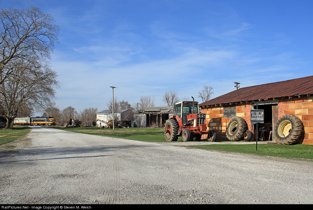 The quiet farm town of Disco is interrupted by the Canadian tuned K3LA of light power A-B-A F9's as they return to Laharpe after setting out 60 cars on the TPW main for storage.