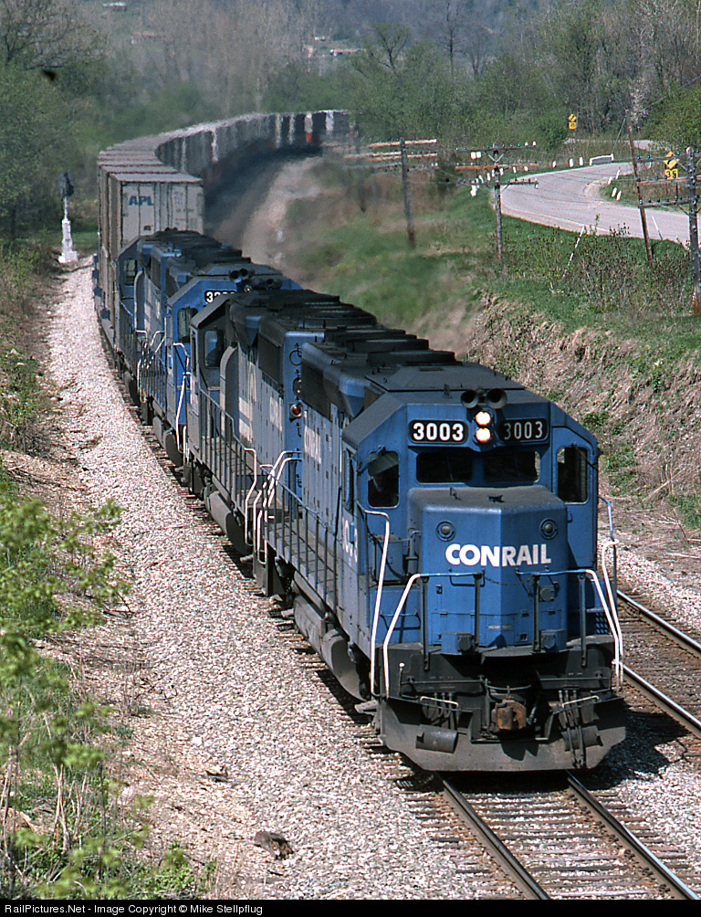 | The Carson bridge just East of Canisteo makes a nice vantage point for CR stack train TV-302. It was nice to see that older GP40 on the point. Because of the ex EL right of way being engineered to accomodate larger loads, the Southern Tier initially was the route that all stack trains used in NY. Once CR finished its clearance improvement project on the old NYC main, these trains were moved to that routing. |