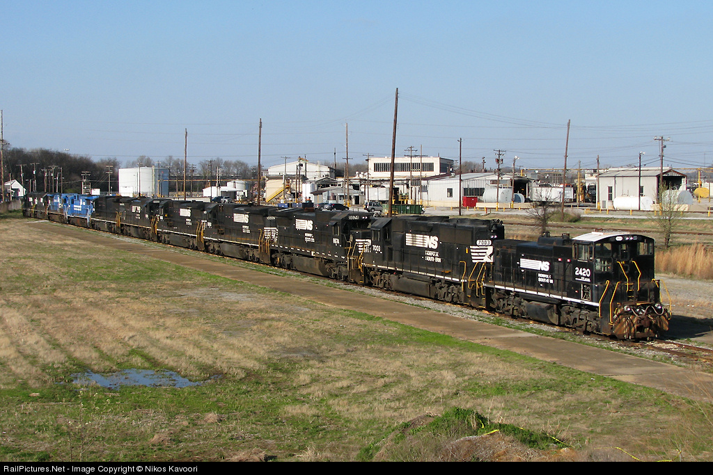 A long string of interesting units occupy s the deadline at DeButt's yard in Chattanooga. First up is MP15DC 2420, which must have had a major problem to end up here. Of interest are the three GP50's, including one second to the end, the units, 7003, 7077, and 7088 were reactivated just weeks after this shot was taken. The 7003 had been stored for almost a year. The fates of the GE's will probably not be as good, the majority of the units are C39-8E's, which were preproduction C40-8's. The two blue units and the one solid black units are C39-8's, probably some of the last left on the property, they will likely end up as scrap metal.