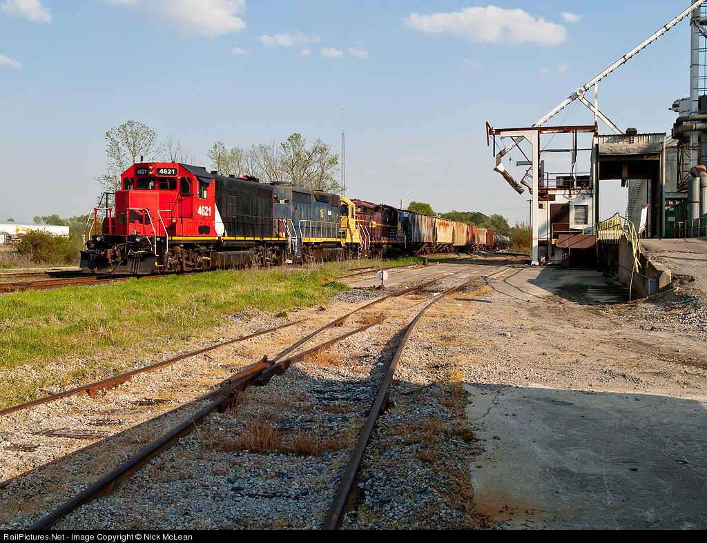 The "motley crew" waits in the Wilson yard on Easter afternoon to take a train of soybeans and empty sulfur tanks to Raleigh the next morning. The lashup includes a GP9R, GP35, and SD9, typical of CLNA's bandit power. The 4621 is the "newest" addition to this growing shortline's roster. She wore GTW blue and red through 2006, after which she received her CN red, black, and white. However, by 2009 4621 was placed in the deadlines of Homewood, IL. Fortunately, unlike many other units, this old girl moved south to a new home. CLICK HERE for more members of CLNA's motley crew around rural NC.