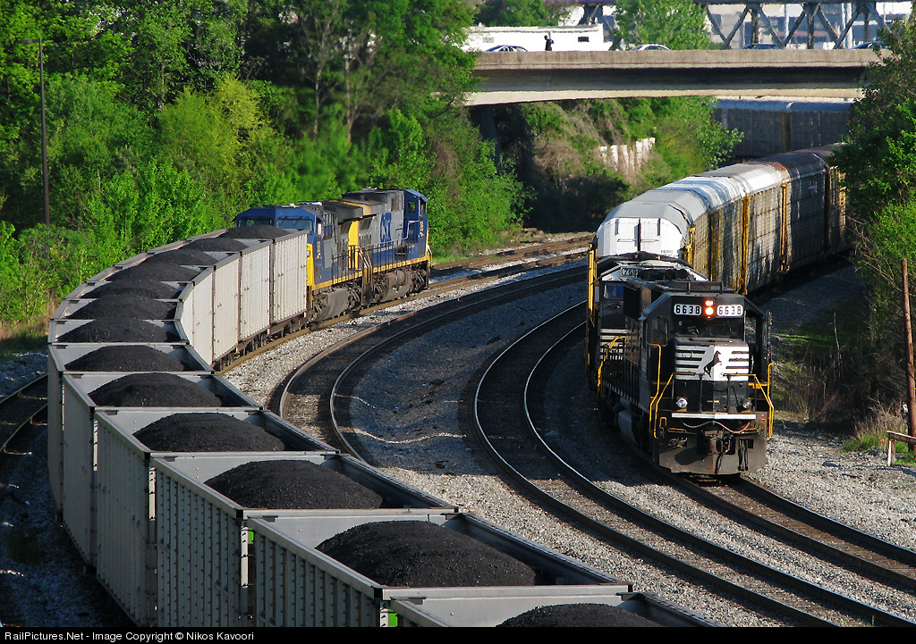 | The Artery of Atlanta A NS southbound rack train with a nice standard cab leader waits at Jefferson St. for a mechanic to sort out some issues with the lead unit while a CSX loaded coal train heads for the Georgia Road. |