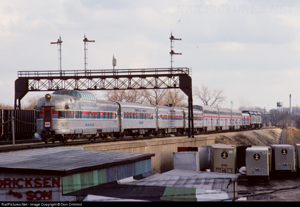 A matched Amtrak-painted Texas Chief departs Joliet Union Depot for its journey to Houston, Texas. Former California Zephyr dome-sleeper-observation Silver Lookout puts the finishing touch on the train.