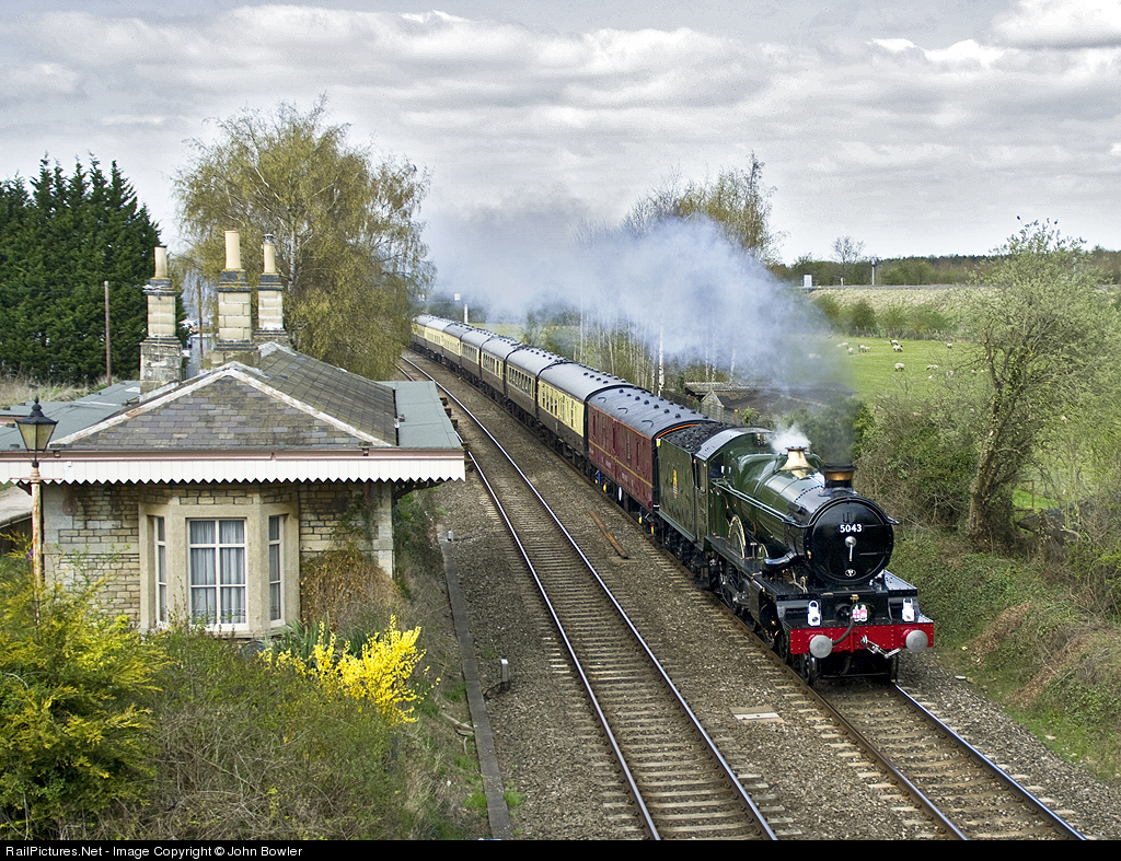 | Having just passed Aynho Junction, the former GWR Mainline can be seen on the horizon just above the locomotive, GWR 5043 'Earl of Mount Edgcumbe' now thunders through the site of the former Aynho Station at the head of the 1Z43 1301 Solihull - Slough Excursion |