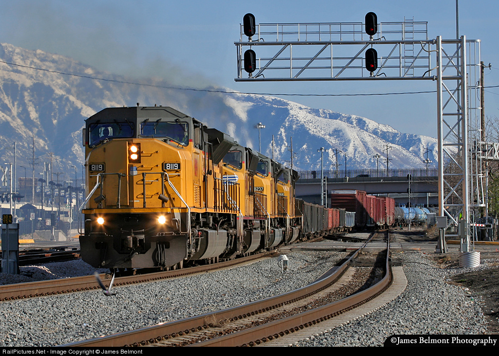 Photographed about three miles into it's long journey from Roper, UT to North Platte, NE, UP's MRONP-14 picks up a little speed at CP RG745, Second South in downtown Salt Lake City. Three SD9043MAC units are in today's power consist with a single SD70M joining in the pull through Grant Tower. The nicely groomed track in the near foreground leads west of downtown Salt Lake City toward both the Lynndyl and Shafter Subdivisions that split from the Salt Lake Sub at Smelter Junction. Note the frightened pigeon flapping it's wings just ahead of the UP 8119's pilot.