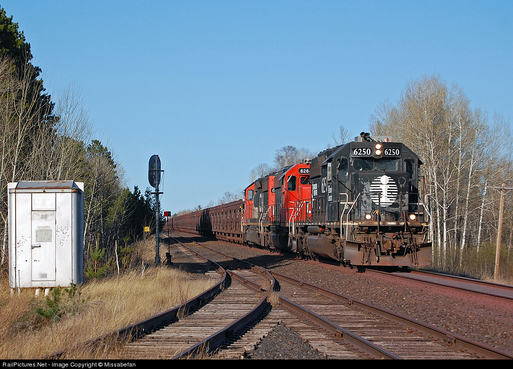| One hundred twenty empty ore jennies under the leadership of Illinois Central 6250 pass by the former signal and switch leading to Eveleth Taconite's Thunderbird South crusher and loadout area on the Iron Range Sub. and continue on to U.S. Steel's Minntac plant for loading. |