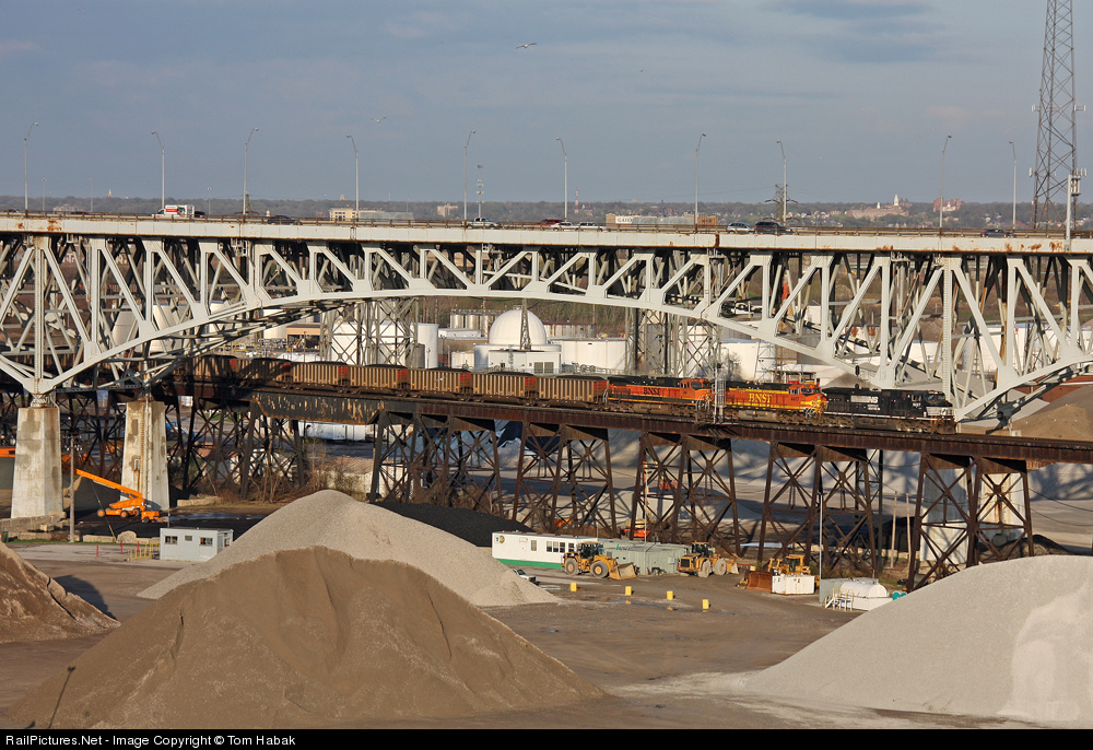 | NS 554 rolls under the soon to be replaced Inner Belt Bridge, with 130 loads. The train is hauling coal from Bailey Mine near Waynesburg PA, to the CEI plasnt in Avon Lake OH. |